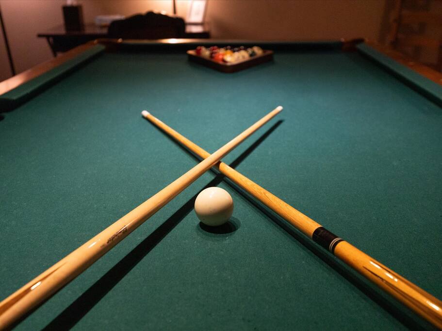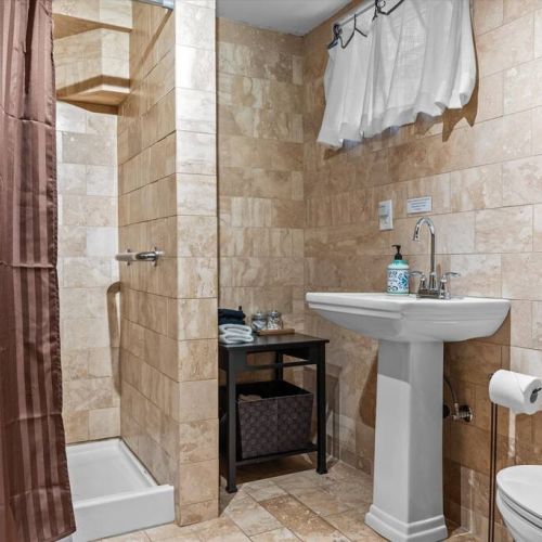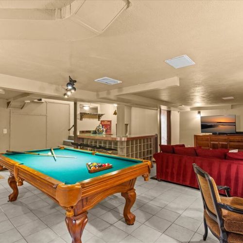 Finally, the lowest floor is accessible by another sweeping staircase from the main floor of the house. The bonus room is highlighted by a pool table, a bar, and TV. There is an additional bedroom with a king-sized bed and bathroom with shower on the lower floor.