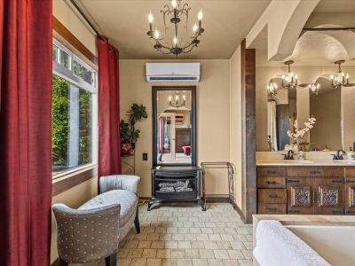 From the main floor, a curving stone staircase sweeps up to the second floor with 3 bedrooms and 2 bathrooms. Each room is furnished with care and all bathrooms have custom tile work. The main bathroom has a walk-in shower with therapeutic black stones inlaid into the floor providing a spa-like experience. The master bathroom has an extra-long 2 person soaking tub where you can pamper yourself in front of a charming gas fireplace. The master bedroom provides another breath-taking view of the water that is as romantic as it is majestic. Get even closer to the sounds and smells of nature from your own private deck as the sun sets beyond the Sound and mountains.