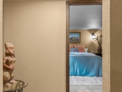 The living room hosts a series of custom archways framing the prominent water view and leading to double French doors that open up to a 330 SF deck, great for relaxing, a BBQ, or entertaining. A gas fireplace and heated floors keep this room cozy while the travertine stone tiles exude beauty and elegance. And for those who want to enjoy a movie in front of the fire, there is a 70” TV with Sonos speakers. The main floor also includes a bathroom, full-size washer & dryer, a dining table, and additional TV in the kitchen along with access to the yard and gardens.