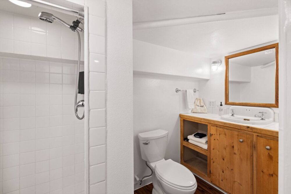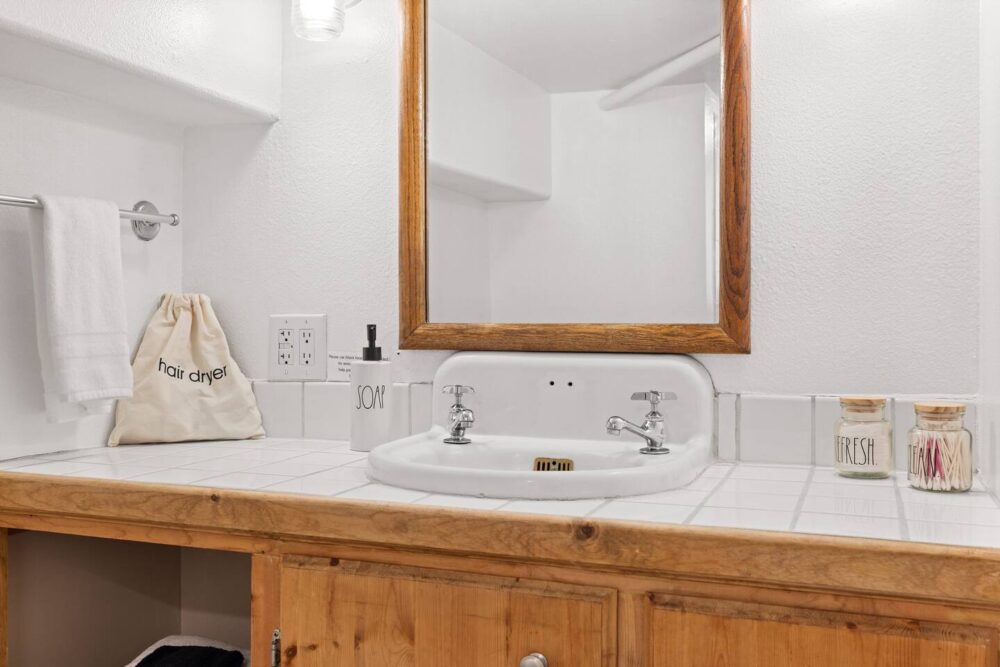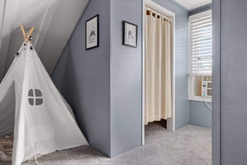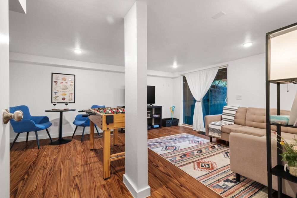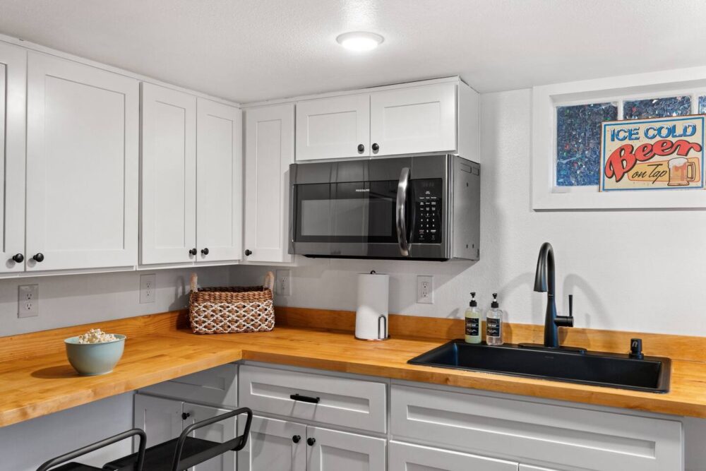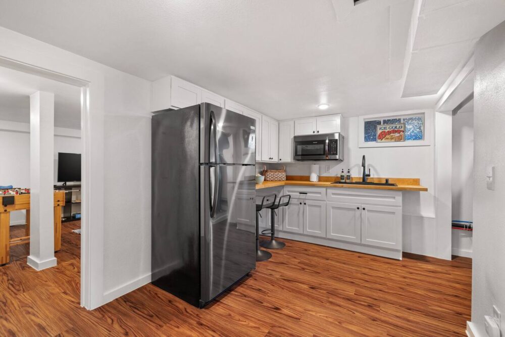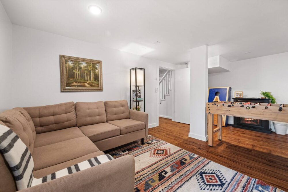 The upper living room offers a cozy sitting area with books, games and a smart TV for your family’s enjoyment. The kitchen has all the essentials including a gas range/oven, refrigerator, coffee maker (both drip coffee and single coffee pod use available), microwave and toaster. Just off the kitchen is a large dining area that seats 6 and a bar that seats 2. We also have a folding table in the basement that seats 4 that is flexible to move around the house/yard as needed.