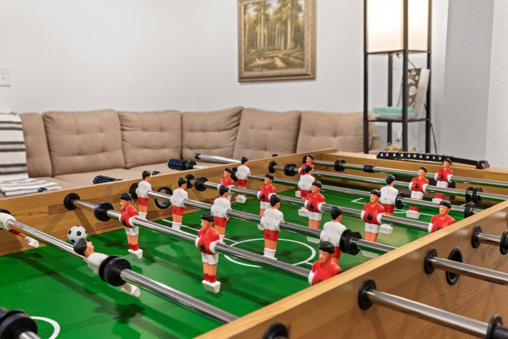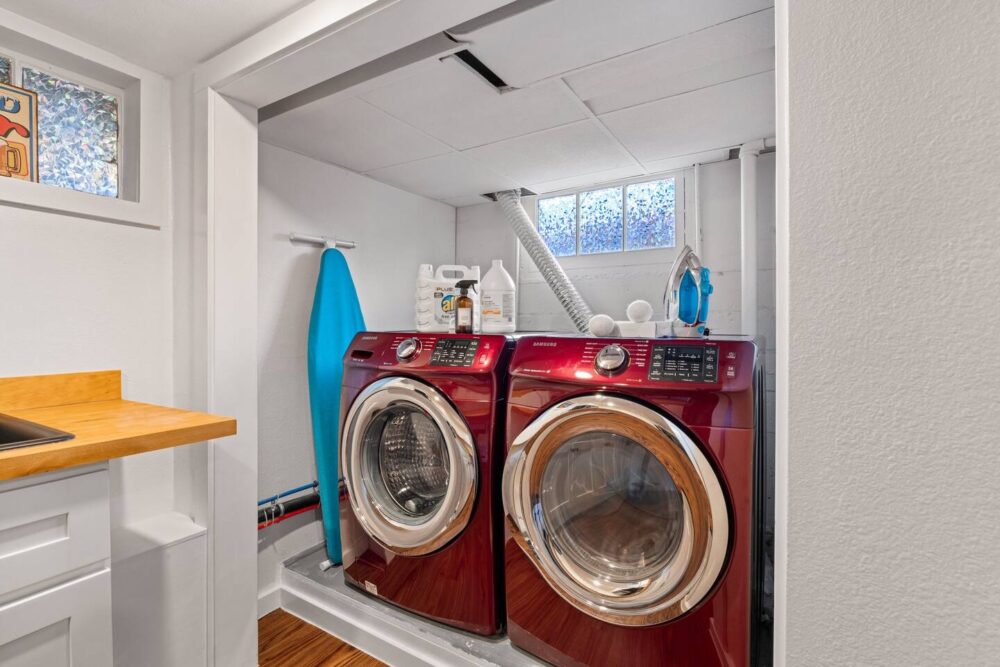 The laundry room, kitchenette and "Game Room" are located in the basement with access to the backyard. We have Cornhole boards for you to take out on a sunny day, as well as outdoor dishes you can use for a family dinner in our park-like yard.