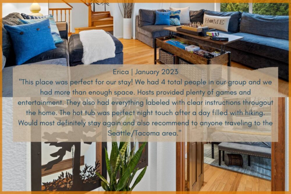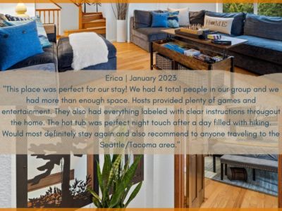 Great location and lovely home. We had a wonderful stay with our family of 4. Would definitely recommend it to anyone who needs a great house in the Seattle area. Loved the backyard and the hot tub!